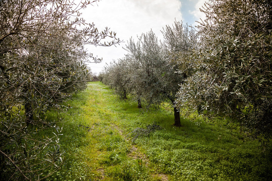 Da sempre, manteniamo il suolo inerbito tutto l'anno rispettando così la fertilità del terreno, riducendo l'impatto ambientale e l'erosione. Procediamo con il primo sfalcio prima della ripresa vegetativa, trinciando contemporaneamente anche i residui della potatura, evitando la competizione idrica fra il prato e l'olivo.